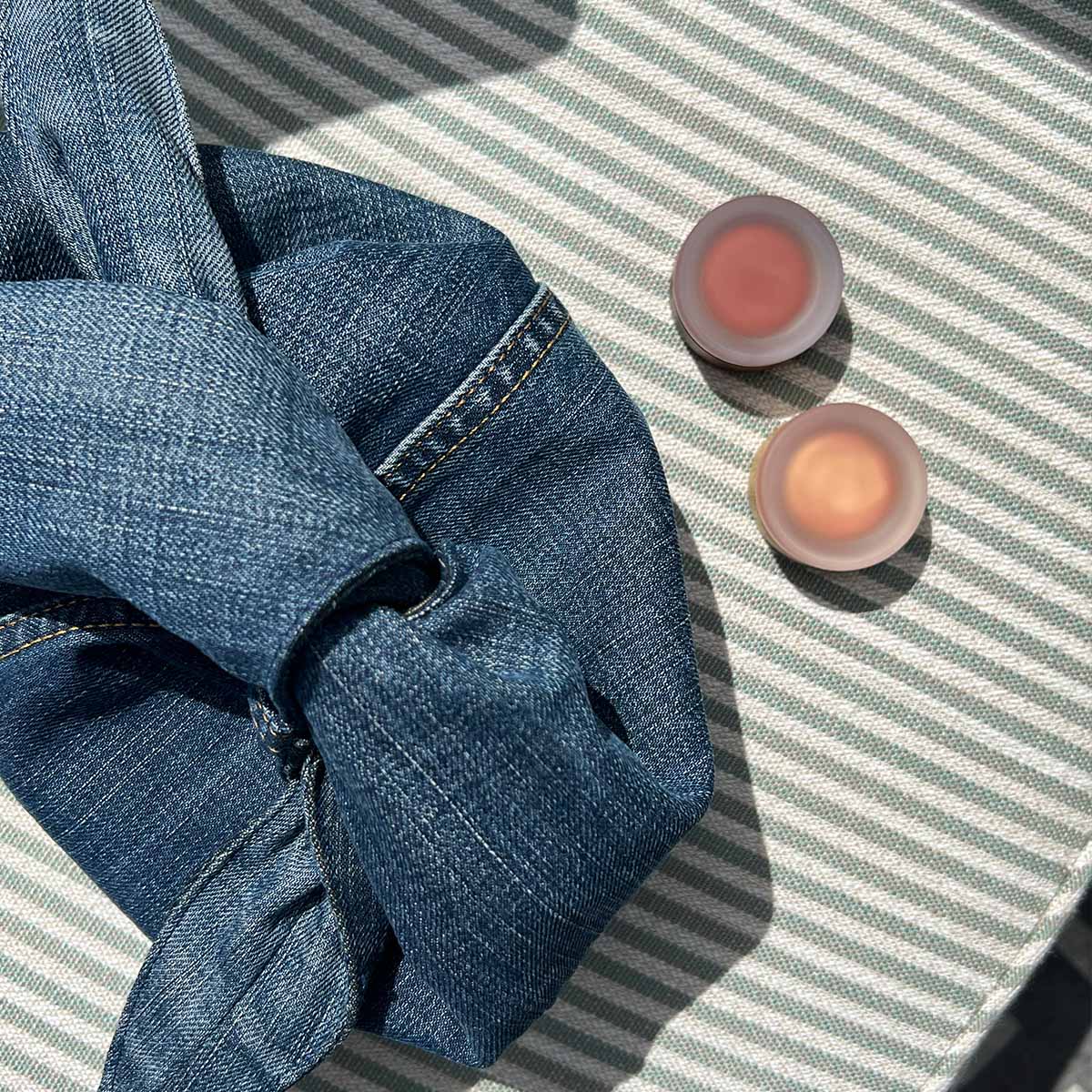 Multi-Use tinted balms and a handmade make-up bag from vintage denim.